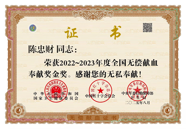日前,国家卫健委、中国红十字会总会、中央军委后勤保障部卫生局联合公布了“2022-2023年度全国无偿献血表彰名单”,公司员工陈忠财凭借多年热血奉献,荣获“全国无偿献血奉献奖金奖”。这既是对他个人善举的高度肯定,也彰显了长九人践行社会责任的精神风貌。