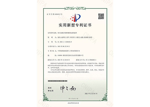 【实用新型专利】实用新型专利证书 砂石泥粉含量用检测装置(水电八局)