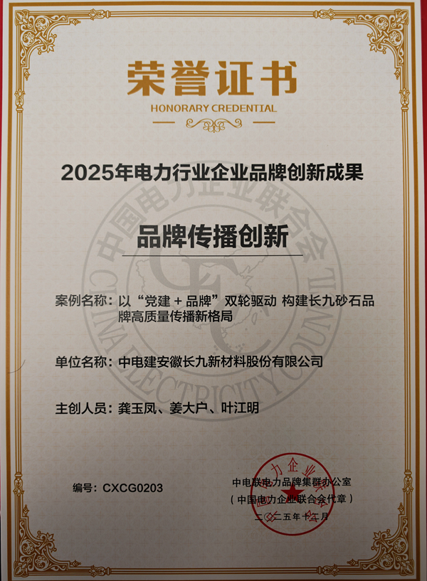 日前,公司《以“党建+品牌”双轮驱动构建长九砂石品牌高质量传播新格局》案例荣获2025年电力行业企业品牌创新成果品牌传播创新奖。
